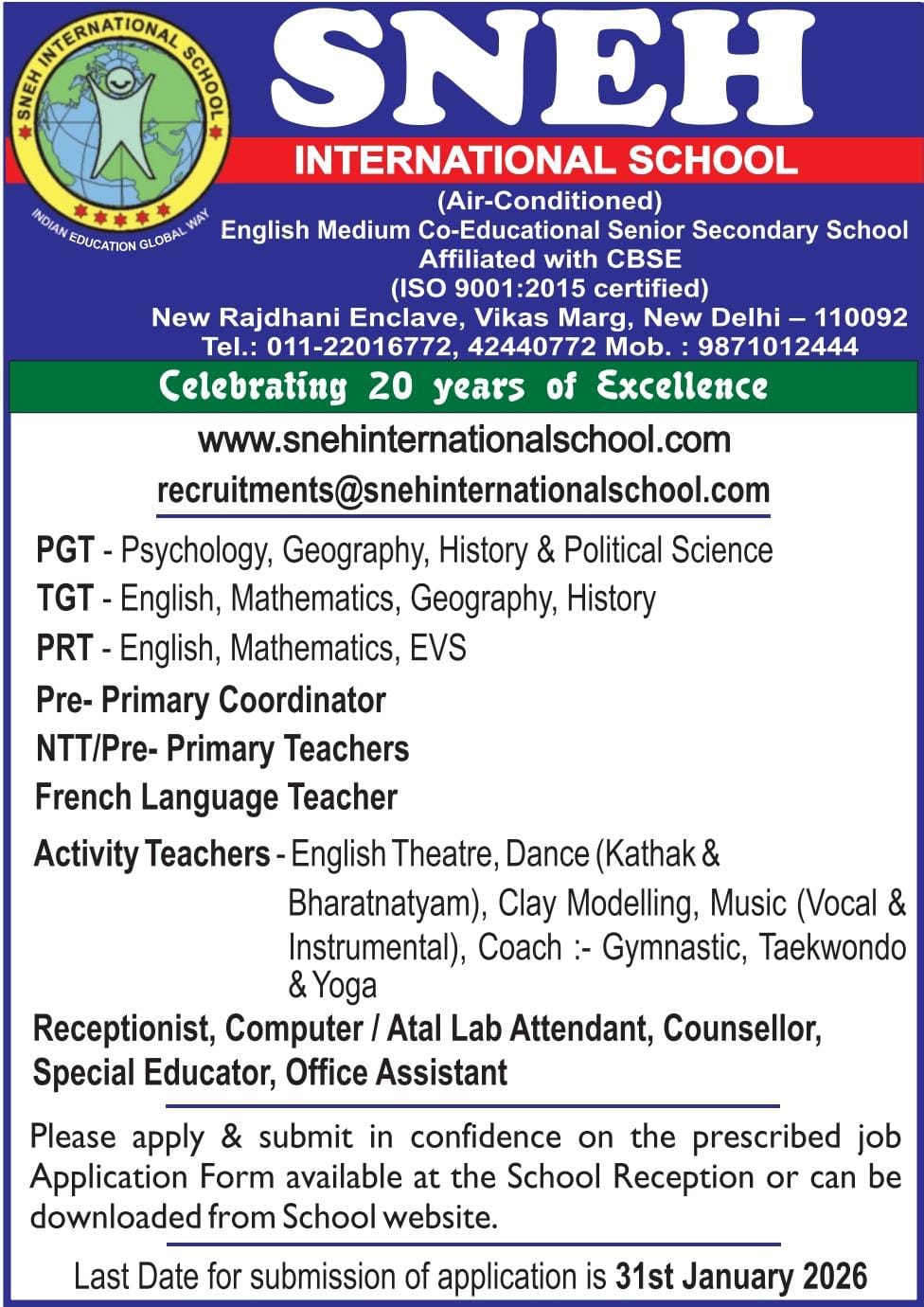 SNEH International School always welcomes the quality teachers. If you are interested to work with us, then download the application form here , fill it and drop at our school reception. We will appreciate it. Website – www.snehinternationalschool.com